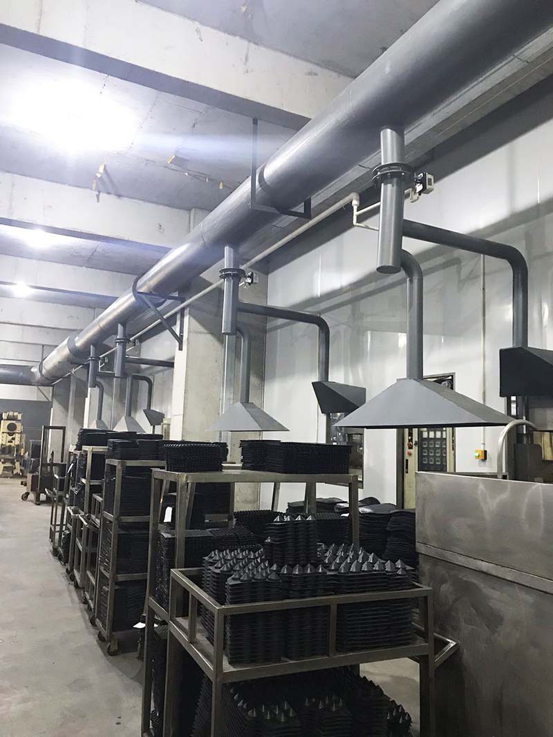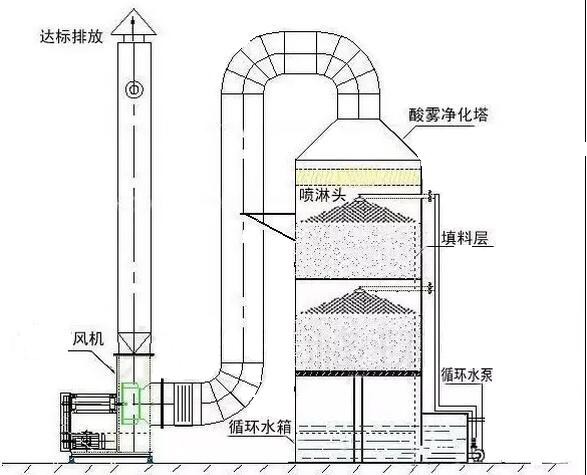 工作原理:废气净化喷淋塔主要的运作方式是废气由风管引入净化塔,经过填料层,废气与氢氧化钠吸收液进行气液两相充分接触吸收中和反应,废气经过净化后,再经除雾板脱水除雾后由风机排入大气。吸收液在塔底经水泵增压后在塔顶喷淋而下,然后回流至塔底循环使用。净化后的废气达到地方排放标准的排放要求,低于国家排放标准。